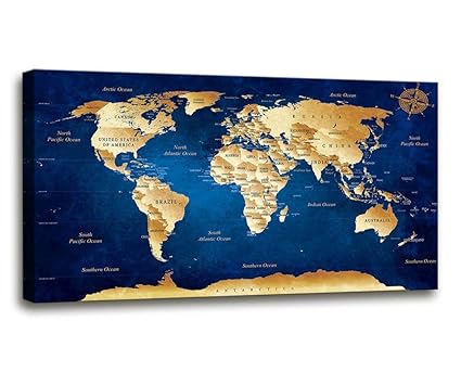 Amazon.com: Wall Art blue map of the world Painting Ready to Hang Watercolor World Map 3 Painting by Naxart Studio.
